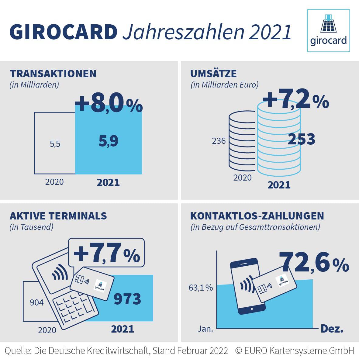 - Im Jahr 2021 betrug der Anteil der kontaktlosen Girocard Transaktionen 72,6%.***